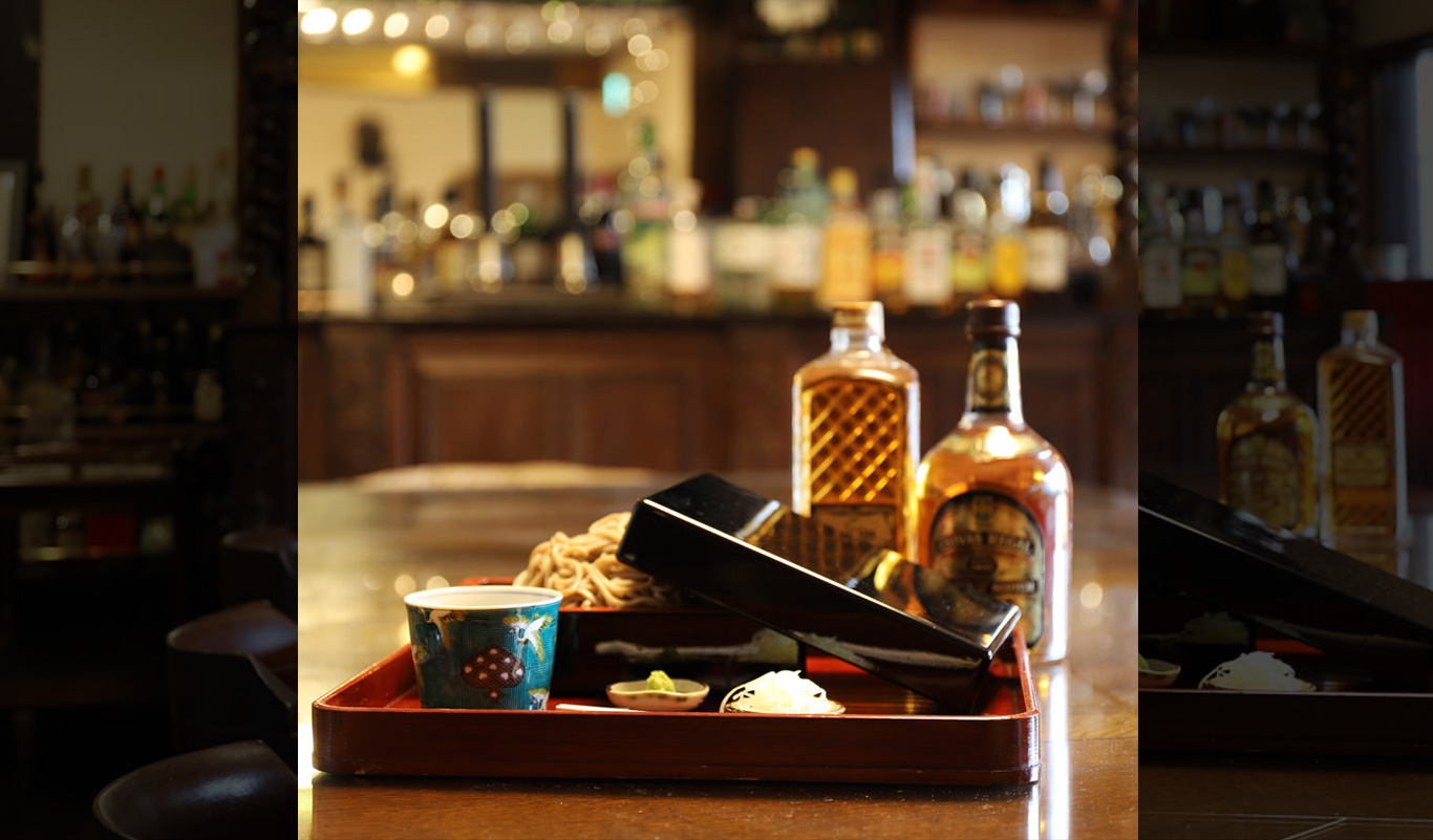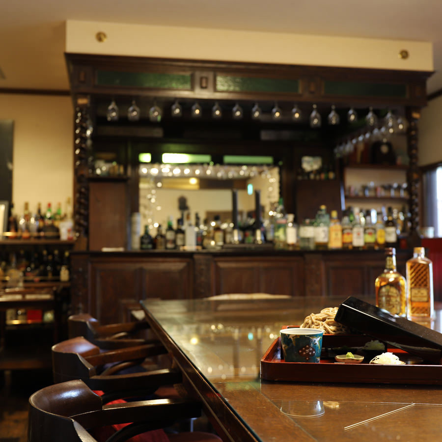 昼はそば屋、夜はバーラウンジとしてお使いいただけます。ずらりとカウンターに並べられたお酒のボトルは圧巻!